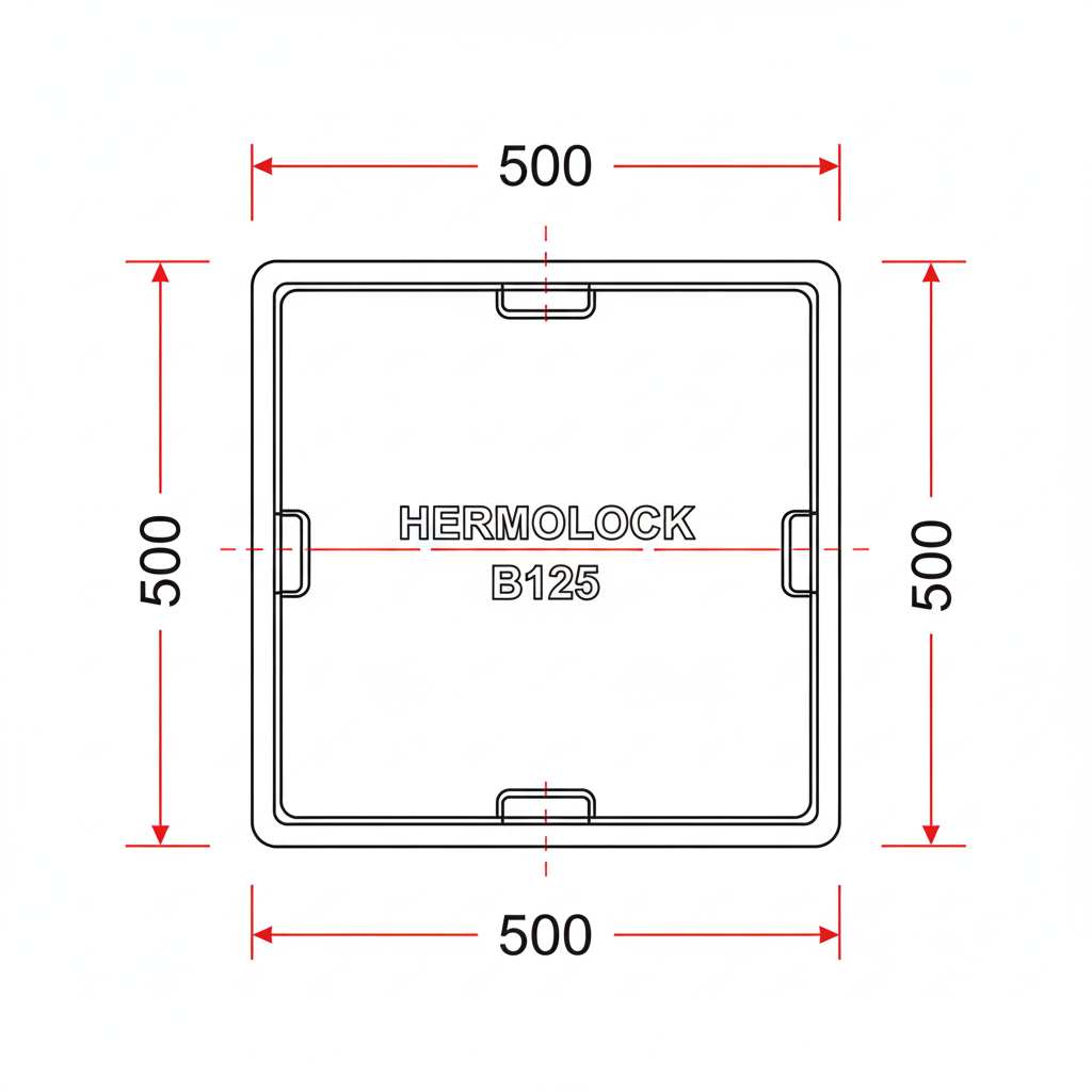 Hermelock B125 50x50 cm: Composiet deksel, 50x50 cm kader, draagt 12,5 ton, geschikt voor parkeerplaatsen.